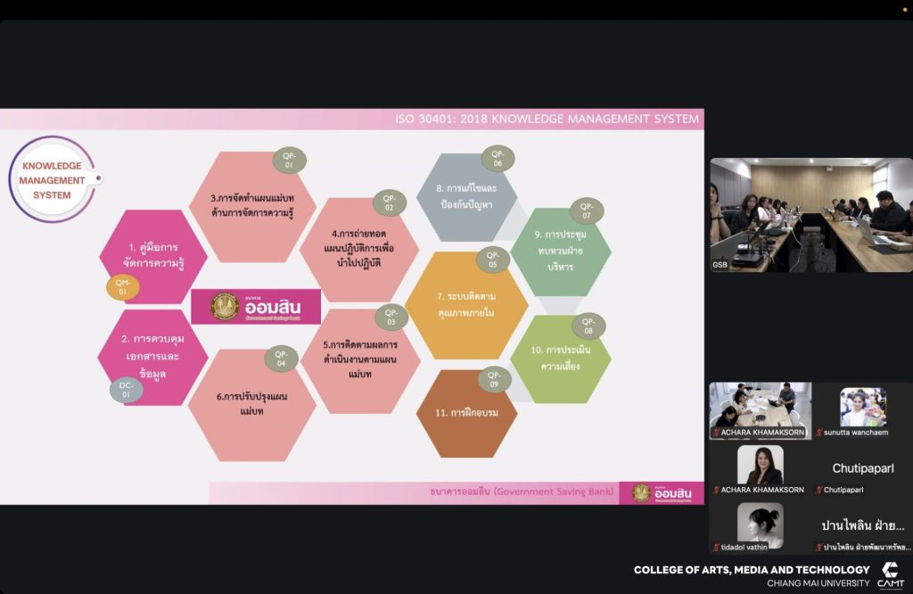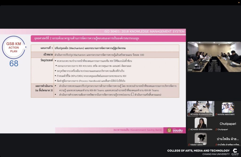 ศูนย์การพัฒนาองค์ความรู้และการจัดการนวัตกรรม (Knowledge and Innovation Development: KIND) วิทยาลัยศิลปะ สื่อ และเทคโนโลยี มหาวิทยาลัยเชียงใหม่ ร่วมกับ ธนาคารออมสิน สำนักงานใหญ่ นำโดย ผู้ช่วยศาสตราจารย์ ดร.อัจฉรา คำอักษร ผู้ปฏิบัติหน้าที่ช่วยคณบดี ด้านการพัฒนาองค์ความรู้และการจัดการนวัตกรรม/ หัวหน้าศูนย์การพัฒนาองค์ความรู้และนวัตกรรม (Knowledge and Innovation Development: KIND) พร้อมด้วย ผู้ช่วยศาสตราจารย์ ดร.เฉลิมพล คงจิตต์ ผู้ช่วยศาสตราจารย์ ดร.อัครพล นิมมลรัตน์ และนางสาวธณัฐพร จันทร์แสง ร่วมเป็นวิทยากรจัดอบรมเชิงปฏิบัติการผ่านระบบออนไลน์ (Zoom) ในหัวข้อ การตรวจประเมินภายในตามกรอบมาตรฐาน ISO 30401: 2018 ภายใต้โครงการ “หลักสูตรการพัฒนาและเสริมสร้างขีดความสามารถด้านการจัดการความรู้” ให้แก่ ทีมงานด้านการจัดการความรู้ ธนาคารออมสิน สำนักงานใหญ่ ในวันที่ 13 พฤศจิกายน 2568