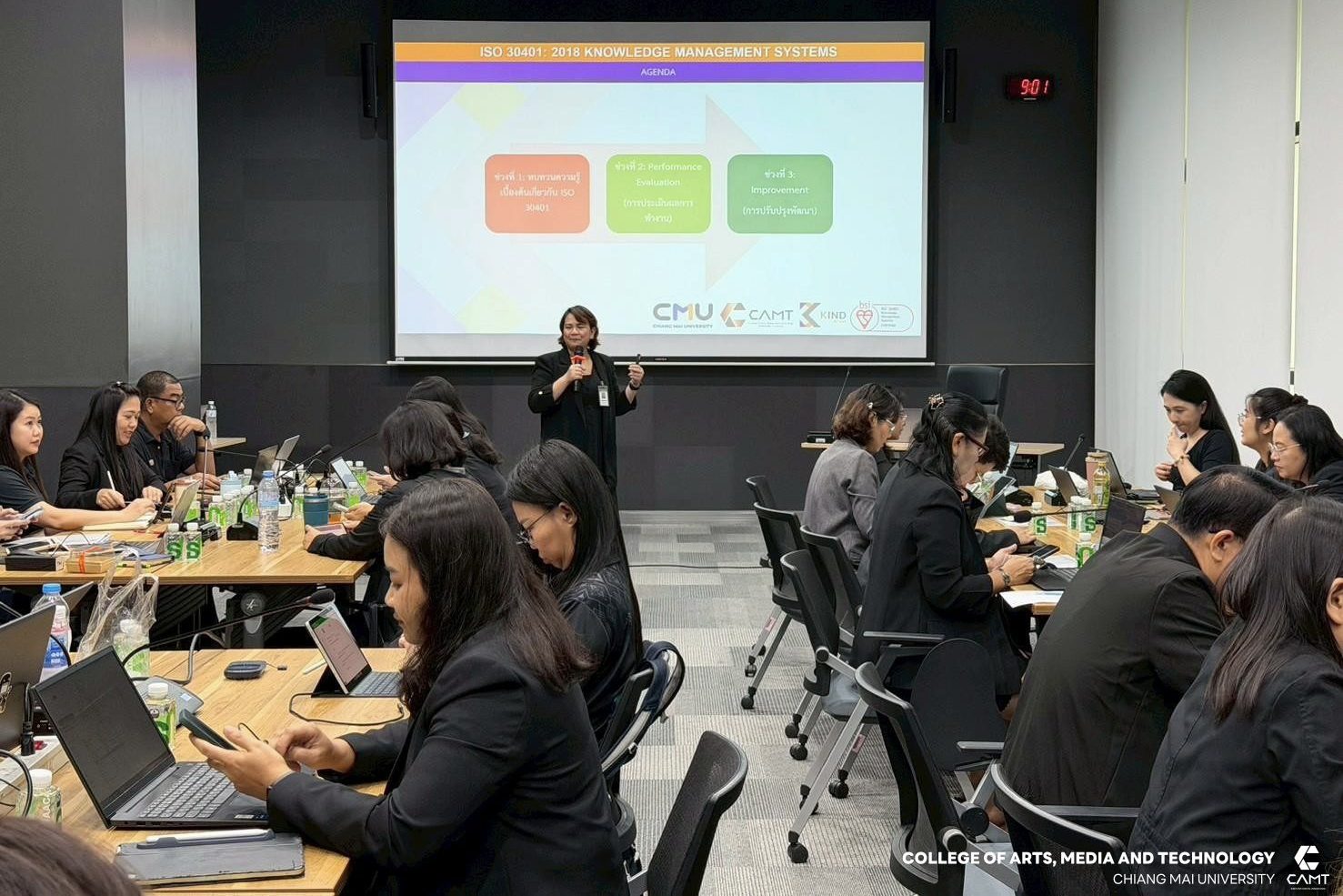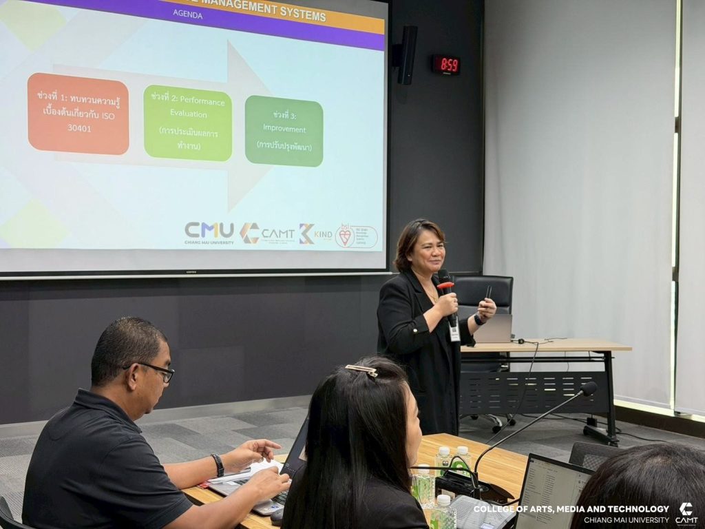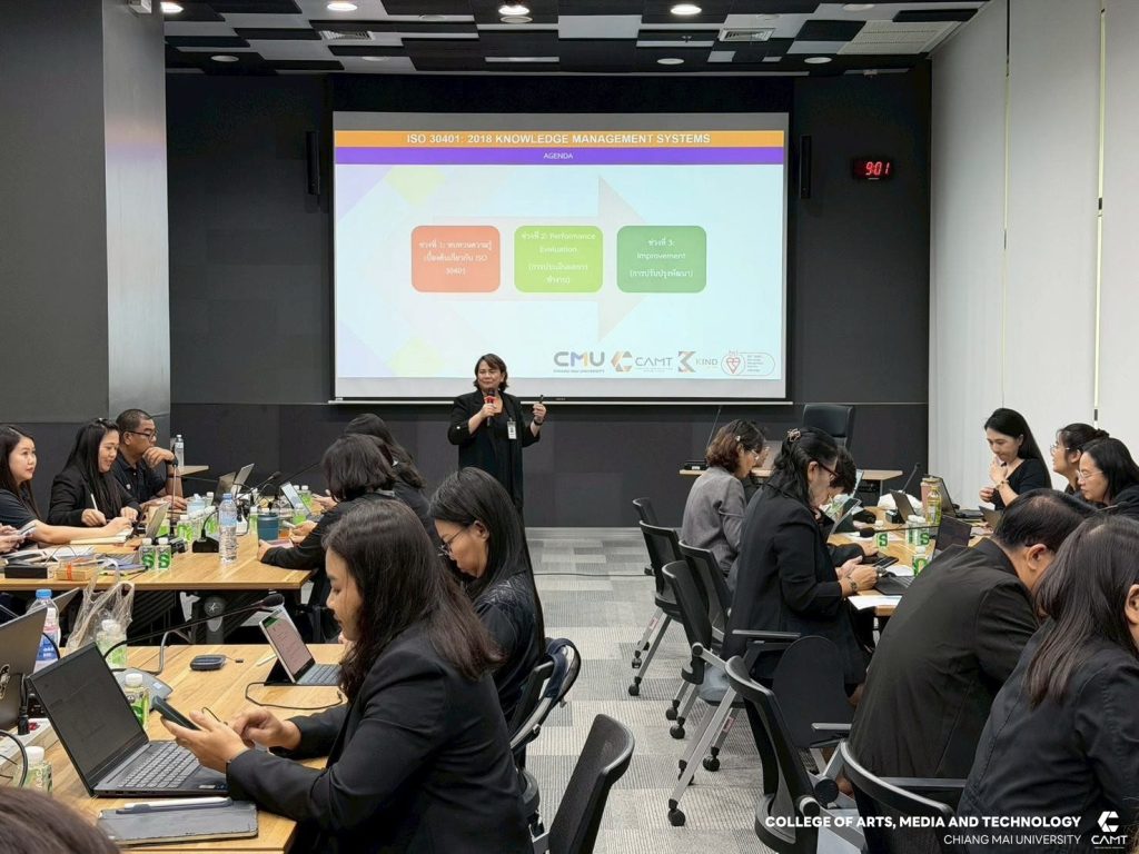 ศูนย์การพัฒนาองค์ความรู้และการจัดการนวัตกรรม (Knowledge and Innovation Development: KIND) วิทยาลัยศิลปะ สื่อ และเทคโนโลยี มหาวิทยาลัยเชียงใหม่ ร่วมกับ ธนาคารเพื่อการเกษตรและสหกรณ์การเกษตร (ธ.ก.ส) โดยมี ผู้ช่วยศาสตราจารย์ ดร.อัจฉรา คำอักษร ผู้ปฏิบัติหน้าที่ช่วยคณบดี ด้านการพัฒนาองค์ความรู้และการจัดการนวัตกรรม/ หัวหน้าศูนย์การพัฒนาองค์ความรู้และนวัตกรรม (Knowledge and Innovation Development: KIND) พร้อมคณะทำงาน ดำเนินกิจกรรมการฝึกอบรมเชิงปฏิบัติการ เรื่อง การจัดทำเอกสารตามกรอบมาตรฐาน ISO 30401: 2018 (ครั้งที่ 3) โดยมีเนื้อหาเกี่ยวกับระบบการควบคุมเอกสารในองค์กรด้านการจัดการความรู้ การจัดทำระเบียบวิธีปฏิบัติ เรื่อง การควบคุมเอกสาร และการจัดทำระเบียบวิธีปฏิบัติ เรื่อง การฝึกอบรม ให้แก่ ผู้บริหาร และบุคลากรตัวแทนจากส่วนงานที่ร่วมขับเคลื่อนการจัดการความรู้ขององค์กร ทั้งจากฝ่ายกิจการสาขาภาค และสำนักงานใหญ่ เพื่อพัฒนาความรู้และเตรียมพร้อมพัฒนาระบบฯ สู่การรับรองมาตรฐาน ISO 30401 : 2018 ในวันจันทร์ที่ 10 พฤศจิกายน 2568 ณ ธนาคารเพื่อการเกษตรและสหกรณ์การเกษตร (ธ.ก.ส) กรุงเทพมหานคร โดยมีผู้เข้าร่วมกิจกรรมในครั้งนี้จำนวน 32 ท่าน
