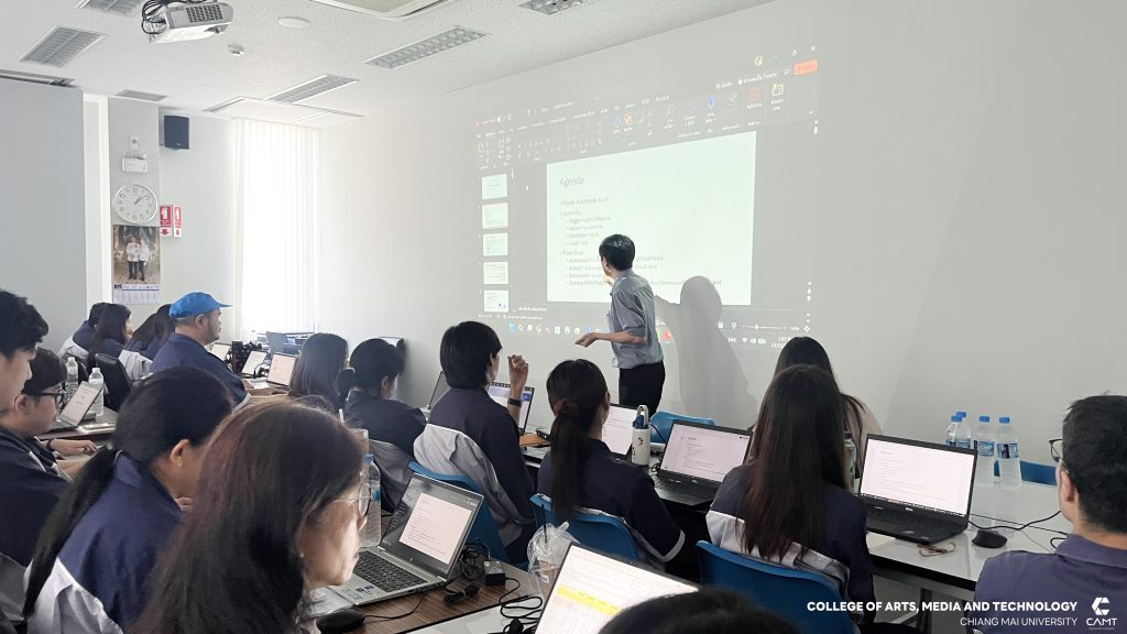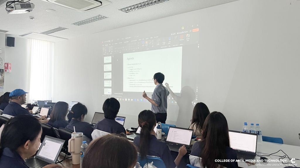 ศูนย์นวัตกรรมและการจัดการเทคโนโลยีดิจิทัล (DITC) วิทยาลัยศิลปะ สื่อ และเทคโนโลยี มหาวิทยาลัยเชียงใหม่ ร่วมกับ บริษัท เคียวเซร่า (ประเทศไทย) จำกัด โดยมีอาจารย์ ดร.ปิยวัช คุณทรงเกียรติ ผู้ปฏิบัติหน้าที่ช่วยคณบดีวิทยาลัยศิลปะ สื่อ และเทคโนโลยี พร้อมด้วยอาจารย์ ดร. ทมะ ดวงนามล ประธานหลักสูตรวิชาบูรณาการดิจิทัลวิทยาลัยศิลปะ สื่อ และเทคโนโลยี ดำเนินการจัดอบรมหลักสูตร “Microsoft Power Automate for Organization” ให้แก่พนักงาน บริษัท เคียวเซร่า (ประเทศไทย) จำกัด จำนวน 50 คน โดยมีวัตถุประสงค์หลักเพื่อช่วยให้ผู้เรียนสามารถสร้าง Workflow อัตโนมัติแบบง่าย ๆ ได้ด้วยตัวเอง รวมถึงความสามารถในการเชื่อมต่อกับ MS365 service ต่าง ๆ ที่ใช้งานในองค์กรได้ เช่น Outlook, SharePoint, Teams, และ Excel นอกจากนี้ หลักสูตรยังมุ่งเน้นให้ผู้เข้าร่วมได้รับความรู้และความเข้าใจเกี่ยวกับการ ออกแบบ Process และจุดเริ่มต้นของ RPA (Robotic Process Automation) ในองค์กรได้ ในวันที่ 15 ธันวาคม 2568 ณ บริษัท เคียวเซร่า (ประเทศไทย) จำกัด