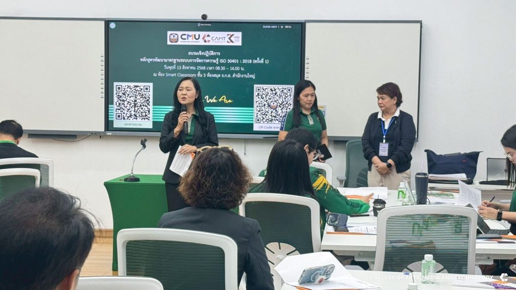 ศูนย์การพัฒนาองค์ความรู้และการจัดการนวัตกรรม (Knowledge and Innovation Development: KIND) วิทยาลัยศิลปะ สื่อ และเทคโนโลยี มหาวิทยาลัยเชียงใหม่ ร่วมกับ ธนาคารเพื่อการเกษตรและสหกรณ์การเกษตร (ธ.ก.ส) โดยมีผู้ช่วยศาสตราจารย์ ดร.อัจฉรา คำอักษร ผู้ปฏิบัติหน้าที่ช่วยคณบดี ด้านการพัฒนาองค์ความรู้และการจัดการนวัตกรรม/ หัวหน้าศูนย์การพัฒนาองค์ความรู้และนวัตกรรม (Knowledge and Innovation Development: KIND) เป็นวิทยากรบรรยายกิจกรรมอบรมเชิงปฏิบัติการ “หลักสูตรพัฒนามาตรฐานระบบการจัดการความรู้ ISO 30401 : 2018” ให้แก่ผู้บริหารและบุคลากรตัวแทนจากส่วนงานที่ร่วมขับเคลื่อนการจัดการความรู้ขององค์กร ทั้งจากฝ่ายกิจการสาขาภาค และสำนักงานใหญ่ เพื่อพัฒนาความรู้และเตรียมพร้อมพัฒนาระบบฯ สู่การรับรองมาตรฐาน ISO 30401 : 2018 เมื่อวันพุธที่ 13 สิงหาคม 2568 ณ ธนาคารเพื่อการเกษตรและสหกรณ์การเกษตร (ธ.ก.ส) กรุงเทพมหานคร