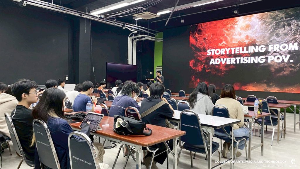 สาขาแอนนิเมชันและวิชวลเอฟเฟกต์ วิทยาลัยศิลปะ สื่อ และเทคโนโลยี มหาวิทยาลัยเชียงใหม่ จัดกิจกรรมบรรยายพิเศษหัวข้อ “Xpert Xperience” เพื่อถ่ายทอดองค์ความรู้และประสบการณ์ตรงด้านการคิดอย่างสร้างสรรค์ (Creativity) ให้แก่นักศึกษาในสาขาแอนนิเมชันและวิชวลเอฟเฟกต์ ซึ่งกิจกรรมดังกล่าวได้รับเกียรติจาก คุณไผ่ ภาคย์ วรรณศิริ ประธานเจ้าหน้าที่บริหารฝ่ายความคิดสร้างสรรค์ (Chief Creative Officer – CCO) บริษัท Wunderman Thompson Thailand ครีเอทีฟรุ่นใหม่ที่มีผลงานโดดเด่นและเป็นที่ยอมรับในวงการ ร่วมเป็นวิทยากรบรรยายพิเศษ เพื่อจุดประกายและเสริมสร้างทักษะการสร้างสรรค์ที่ทันสมัยและเป็นที่ต้องการในอุตสาหกรรมดิจิทัลแก่นักศึกษาอย่างเข้มข้น ซึ่งกิจกรรมนี้เป็นส่วนหนึ่งในรายวิชา 951106: Screenwriting and digital storytelling ภายใต้การดูแลของอาจารย์ ดร.ศุภรดา ประภาวงศ์ อาจารย์ประจำสาขาแอนนิเมชันและวิชวลเอฟเฟกต์ โดยมุ่งเน้นการเชื่อมโยงความรู้ทางวิชาการเข้ากับประสบการณ์จริงจากผู้เชี่ยวชาญในวงการ เพื่อเตรียมความพร้อมให้นักศึกษาได้พัฒนาทักษะที่จำเป็นสำหรับการทำงานในอุตสาหกรรมภาพยนตร์และแอนนิเมชันได้อย่างมีประสิทธิภาพในอนาคต เมื่อวันที่ 11 ตุลาคม 2568 ณ ห้อง112 อาคารวิทยาลัยศิลปะ สื่อ และเทคโนโลยี มหาวิทยาลัยเชียงใหม่