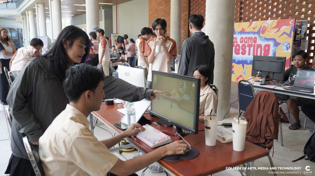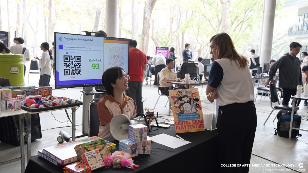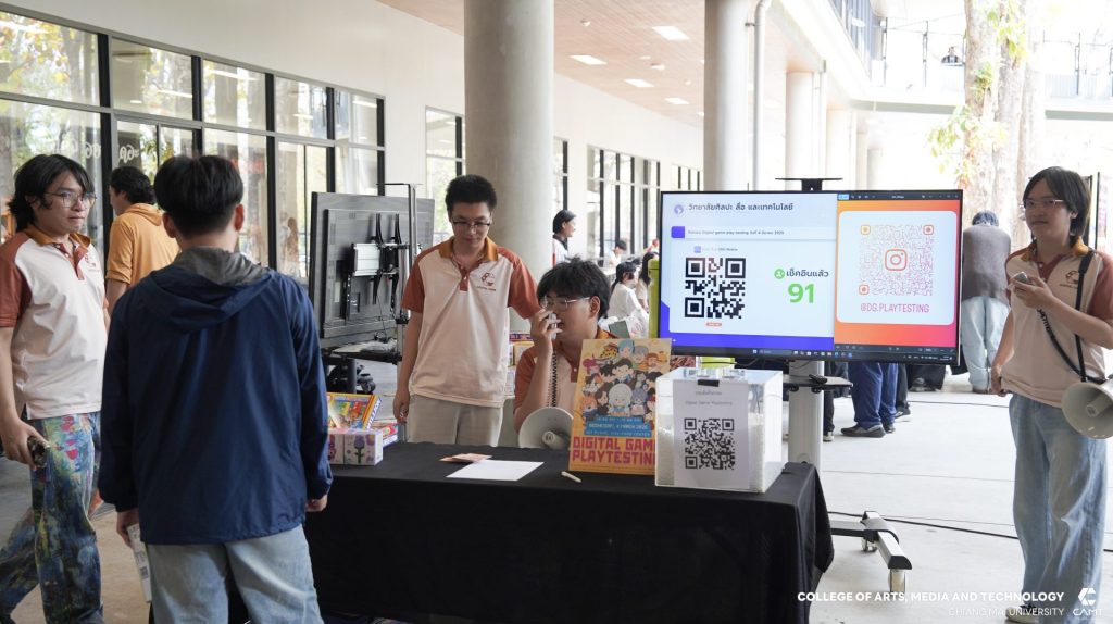 สาขาดิจิทัลเกม วิทยาลัยศิลปะ สื่อ และเทคโนโลยี มหาวิทยาลัยเชียงใหม่ นำโดย ผู้ช่วยศาสตราจารย์ ดร.เกียรติกร สำอางค์กูล พร้อมด้วยอาจารย์ ดร.ศุภรา กรุดพันธ์ อาจารย์ประจำสาขาวิชาดิจิทัลเกม จัดกิจกรรม “Digital Game Playtesting” โดยมีวัตถุประสงค์เพื่อเป็นเวทีแห่งการเรียนรู้และการทดสอบผลงานเกม (Playtesting) ของนักศึกษาสาขาวิชาดิจิทัลเกม ชั้นปีที่ 2 และปีที่ 3 โดยเปิดโอกาสให้นักศึกษาชั้นปีที่ 1 คณาจารย์ ผู้ประกอบการในอุตสาหกรรมเกม และบุคคลทั่วไปที่สนใจ ได้ร่วมทดสอบประสิทธิภาพและสัมผัสประสบการณ์การเล่นเกมที่สร้างขึ้นจริง พร้อมทั้งให้ข้อเสนอแนะเชิงสร้างสรรค์ (Feedback) เพื่อให้นักศึกษานำไปต่อยอดและพัฒนาผลงานให้มีคุณภาพในระดับมาตรฐานสากลต่อไป เมื่อวันพุธที่ 4 มีนาคม 2569 ณ บริเวณศูนย์อาหาร มหาวิทยาลัยเชียงใหม่