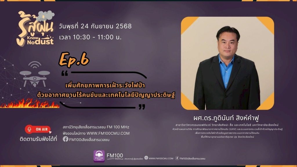 ผู้ช่วยศาสตราจารย์ ดร.ภูดินันท์ สิงห์คำฟู อาจารย์ประจำสาขาวิชาวิศวกรรมซอฟต์แวร์ วิทยาลัยศิลปะ สื่อ และเทคโนโลยี มหาวิทยาลัยเชียงใหม่ และหัวหน้าแผนงานวิจัย การศึกษาพัฒนาอากาศยานไร้คนขับ (UAV) และระบบลาดตระเวนชี้เป้าด้วยปัญญาประดิษฐ์เพื่อการตรวจจับไฟป่าด้วยข้อมูลภาพจากระบบอากาศยานไร้คนขับ พื้นที่ศึกษาอุทยานแห่งชาติสุเทพ-ปุย จังหวัดเชียงใหม่ ให้สัมภาษณ์ในรายการ “รู้สู้ฝุ่น Know Dust, No Dust”  Ep.6 ในหัวข้อ “เพิ่มศักยภาพการเฝ้าระวังไฟป่า ด้วยอากาศยานไร้คนขับและเทคโนโลยีปัญญาประดิษฐ์” เมื่อวันพุธที่ 24 กันยายน 2568 ณ สถานีวิทยุเสียงสื่อสารมวลชน FM 100 MHz