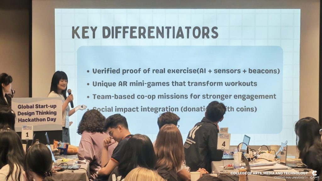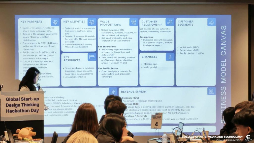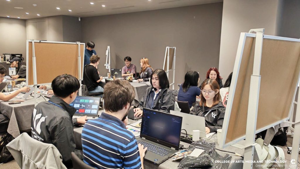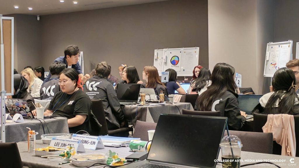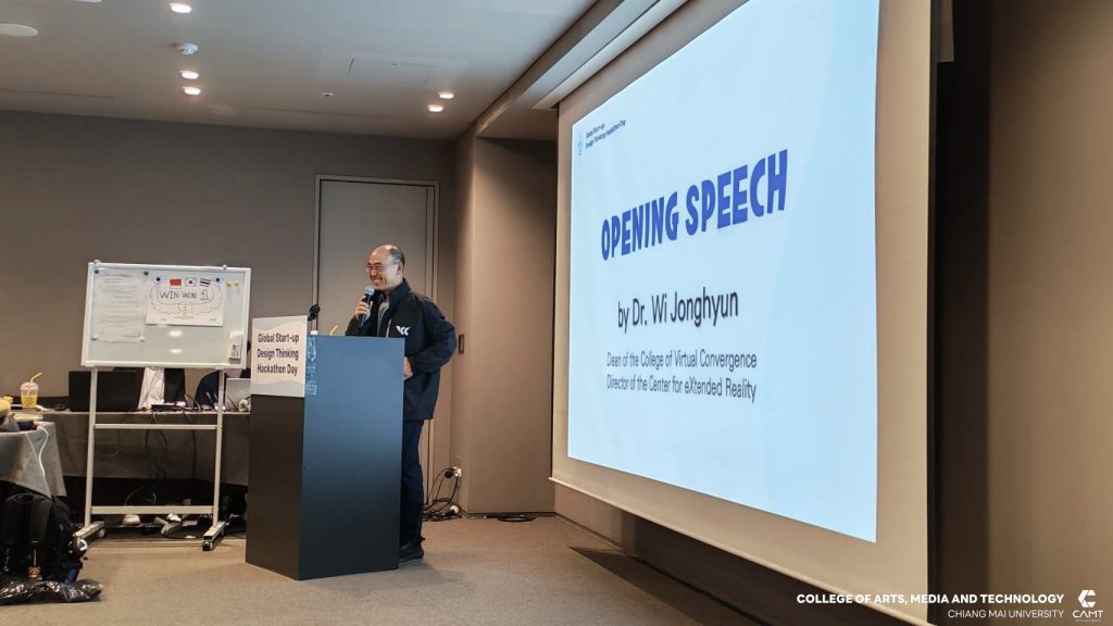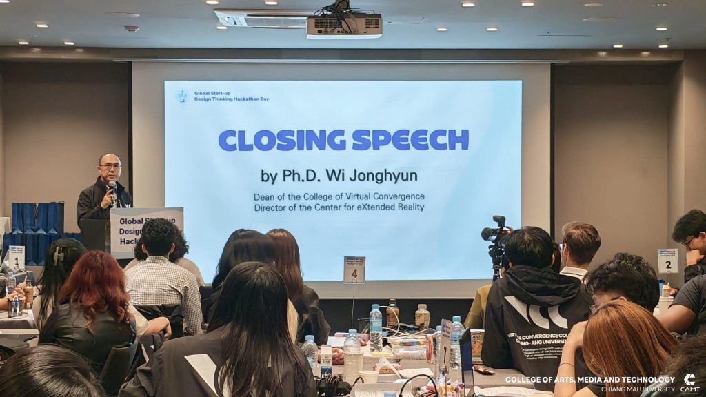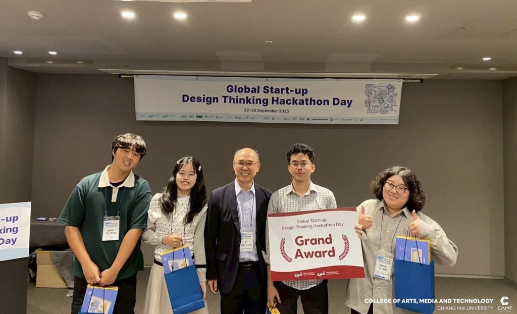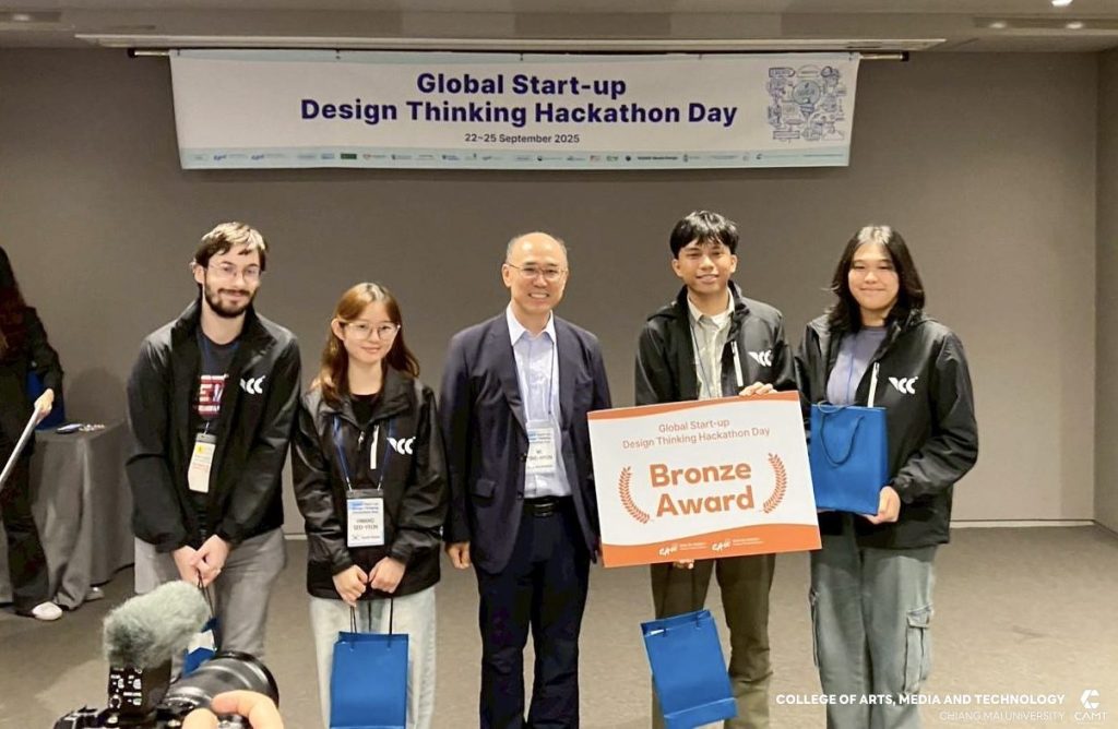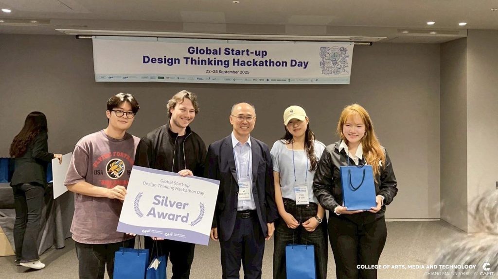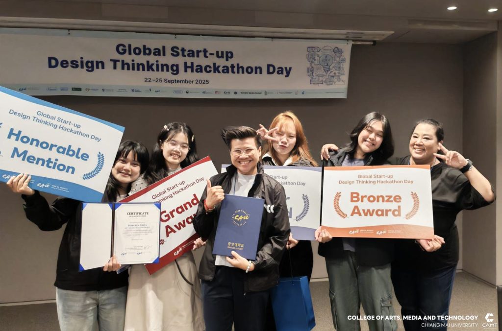 วิทยาลัยศิลปะ สื่อ และเทคโนโลยี มหาวิทยาลัยเชียงใหม่ ขอแสดงความยินดีกับนักศึกษาที่ได้รับรางวัลจากกิจกรรมการแข่งขัน Global Start-up Design Thinking Hackathon day 2025 ซึ่งจัดการแข่งขันโดย Chung-Ang University สาธารณรัฐเกาหลี เพื่อส่งเสริมและสนับสนุนให้นักศึกษาจากทั้งในสาธารณรัฐเกาหลีและนักศึกษาต่างชาติ อาทิ สาธารณรัฐสังคมนิยมเวียดนาม ประเทศอินโดนีเซีย และประเทศฮังการี จาก 12 มหาวิทยาลัย จำนวนกว่า 43 ราย ได้ทำงานร่วมกันเป็นทีมในการคิดค้นนวัตกรรมและวางแผนพัฒนาธุรกิจ นอกจากนี้ ยังเป็นโอกาสสำคัญในการเสริมสร้าง ทักษะการทำงานร่วมกับเพื่อนต่างชาติ เพื่อให้นักศึกษาได้ฝึกฝนทักษะการทำงานในระดับสากล ซึ่งสอดคล้องกับยุทธศาสตร์ของวิทยาลัยฯ ในด้าน SO1 : Excellent learning ecosystem (learning playground) ที่มุ่งเน้นการสร้างสภาพแวดล้อมการเรียนรู้ที่ยอดเยี่ยมและส่งเสริมพื้นที่ให้นักศึกษาได้พัฒนาศักยภาพอย่างเต็มที่ โดยในการแข่งขัน Hackathon ครั้งนี้ นักศึกษาจากวิทยาลัยฯ สามารถคว้ารางวัลจากการแข่งขัน รวม 4 รางวัล ได้แก่