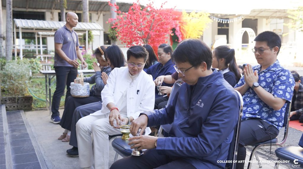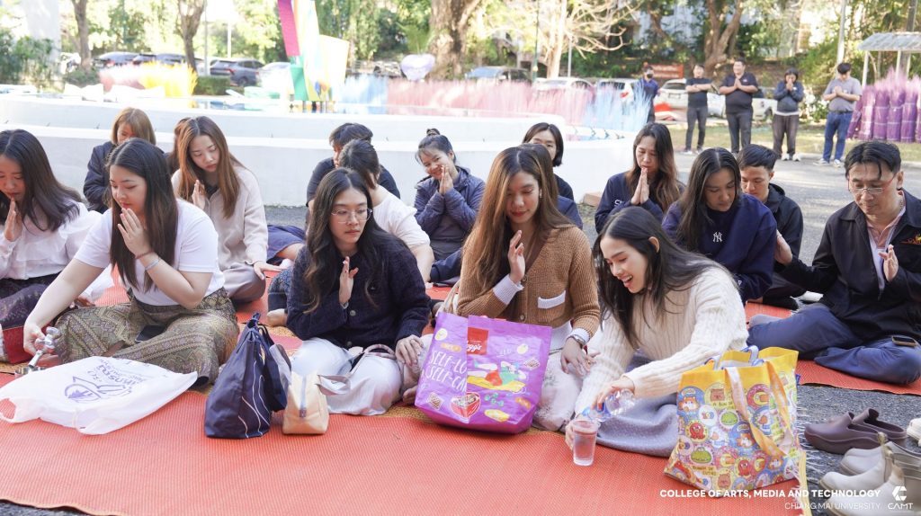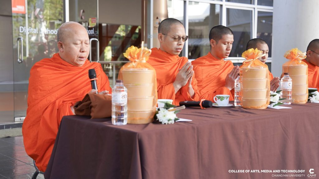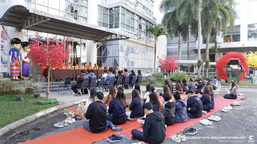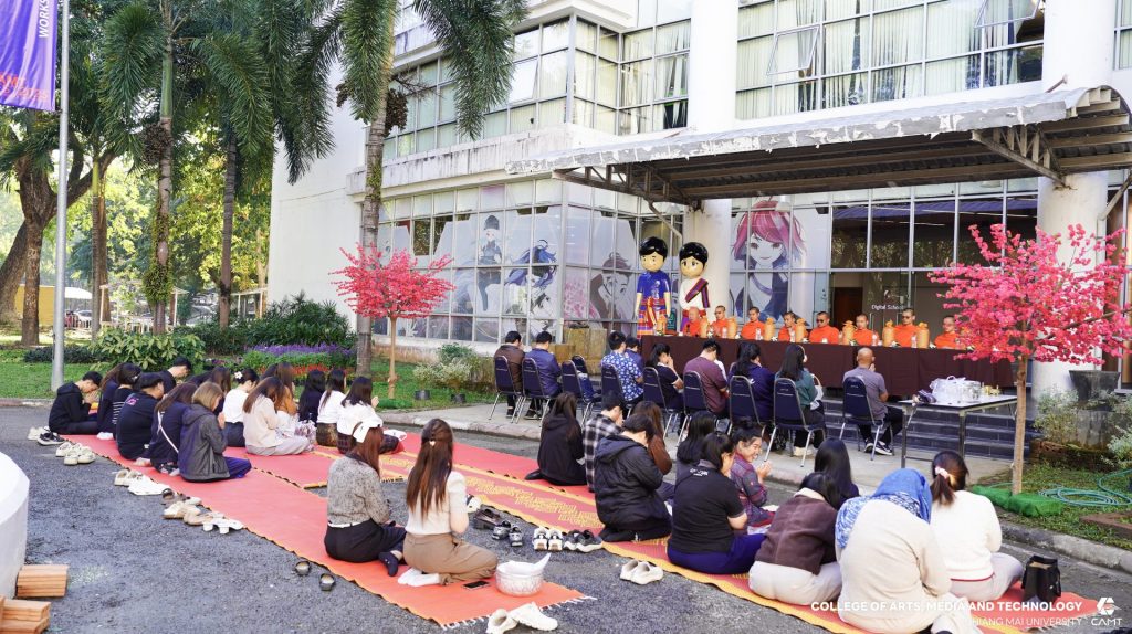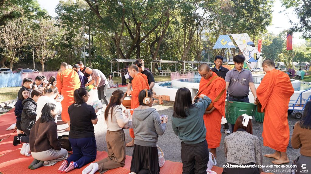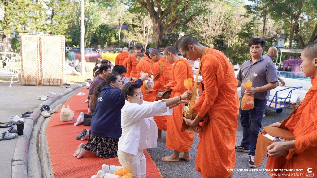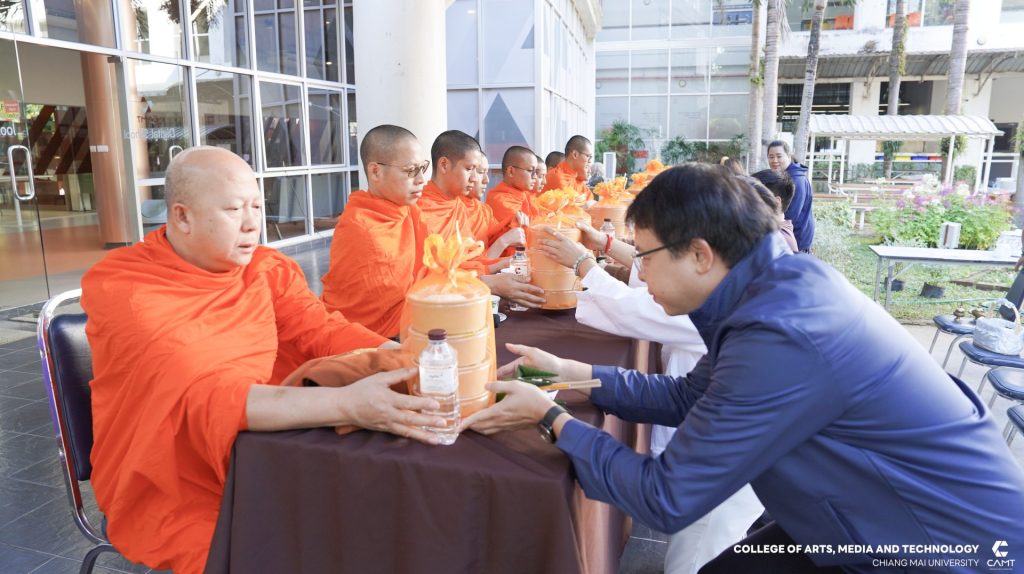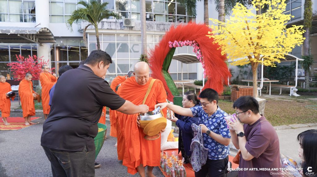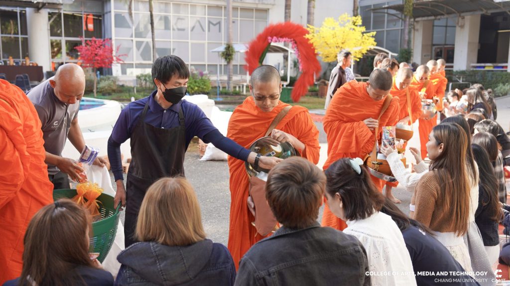 วิทยาลัยศิลปะ สื่อ และเทคโนโลยี มหาวิทยาลัยเชียงใหม่ นำโดยผู้ช่วยศาสตราจารย์ ดร.วรวิชญ์ จันทร์ฉาย คณบดีพร้อมด้วยคณะผู้บริหาร คณาจารย์ และบุคลากร ร่วมใจจัดพิธีทำบุญตักบาตรข้าวสารอาหารแห้งแด่พระสงฆ์จำนวน 9 รูป เพื่อความเป็นสิริมงคลและเป็นการเริ่มต้นศักราชใหม่ด้วยจิตใจที่ผ่องใส ในวันศุกร์ที่ 9 มกราคม 2569 ณ ลานน้ำพุ วิทยาลัยศิลปะ สื่อ และเทคโนโลยี มหาวิทยาลัยเชียงใหม่