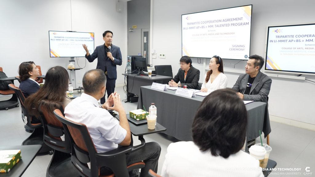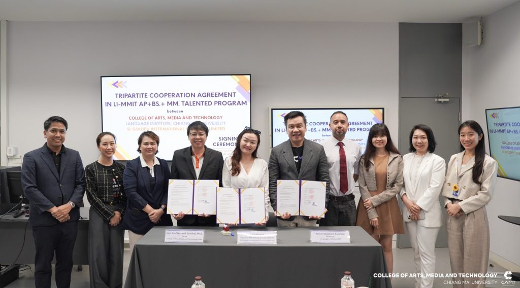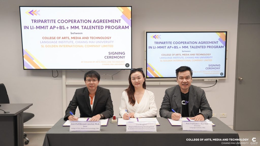 ผู้ช่วยศาสตราจารย์ ดร.วรวิชญ์ จันทร์ฉาย คณบดีวิทยาลัยศิลปะ สื่อ และเทคโนโลยี ร่วมลงนามความร่วมมือสามฝ่ายกับสถาบันภาษา มหาวิทยาลัยเชียงใหม่ โดยผู้ช่วยศาสตราจารย์ สาคร เรือนไกล ผู้อำนวยการสถาบันภาษา พร้อมด้วย Mr. Karim Hussain ผู้จัดการและหัวหน้าฝ่ายต่างประเทศของสถาบันภาษา และ Miss Liu Mingfen ผู้จัดการบริษัท เอสแอล โกลเด้น อินเตอร์เนชั่นแนล จำกัด พร้อมด้วยคุณปริยาภรณ์ ศุภมงคล หัวหน้าฝ่ายวิชาการ และคุณพิณธิกาญจน์ โสตถิพันธุ์กุล ผู้ประสานงานโครงการ