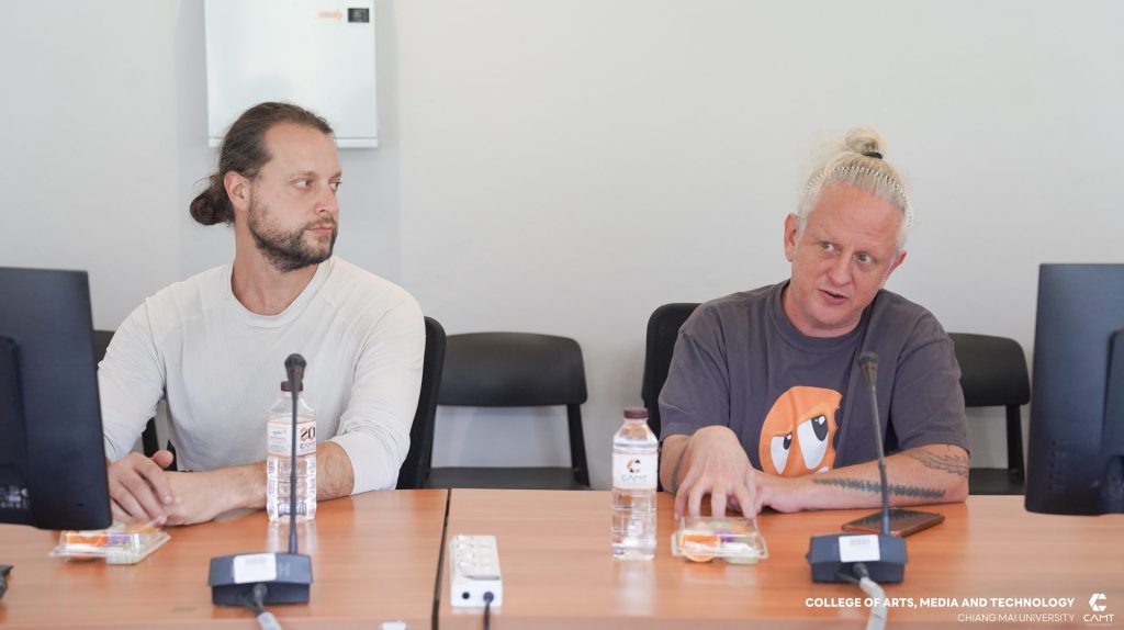 พร้อมด้วย ผู้ช่วยศาสตราจารย์ ดร.อรุษ คุณเขต ผู้ช่วยคณบดี อาจารย์ ดร.ธันยภฤศ ฟองดาวิรัตน์ ประธานสาขาวิชาแอนนิเมชันและวิชวลเอฟเฟกต์ ผู้ช่วยศาสตราจารย์ ดร.มณิษวาส จินตพิทักษ์ อาจารย์ ดร.กฤษกรณ์ บัวเต้า คณาจารย์ประจำสาขาวิชาแอนนิเมชันและวิชวลเอฟเฟกต์ นักศึกษาและเจ้าหน้าที่ฝ่ายประชาสัมพันธ์ ให้การต้อนรับทีมผู้ผลิตภาพยนตร์แอนิเมชัน เรื่อง FLOW นำโดย Léo Silly-Pélissier ตำแหน่ง the animation director of Flow, Dennis Brown – Autotroph ตำแหน่ง CG Cookie, SuperHive (formally Blender Market) และ อาจารย์พรพรรณ วรรณา อาจารย์พิเศษจากคณะมนุษยศาสตร์ ในโอกาสเข้าเยี่ยมชมหลักสูตรการเรียนการสอนของวิทยาลัยฯ รวมทั้งหารือความร่วมมือทางวิชาการในอนาคต โดยมุ่งเน้นการถ่ายทอดองค์ความรู้เฉพาะทางด้านการผลิตแอนิเมชันระดับสากลจากผู้เชี่ยวชาญในภาคอุตสาหกรรมให้แก่นักศึกษาและบุคลากร รวมทั้งการพัฒนากำลังคนสู่ภาคอุตสาหกรรมแอนิเมชันในระดับสากล ในวันที่ 9 มกราคม 2569 ณ วิทยาลัยศิลปะ สื่อ และเทคโนโลยี มหาวิทยาลัยเชียงใหม่