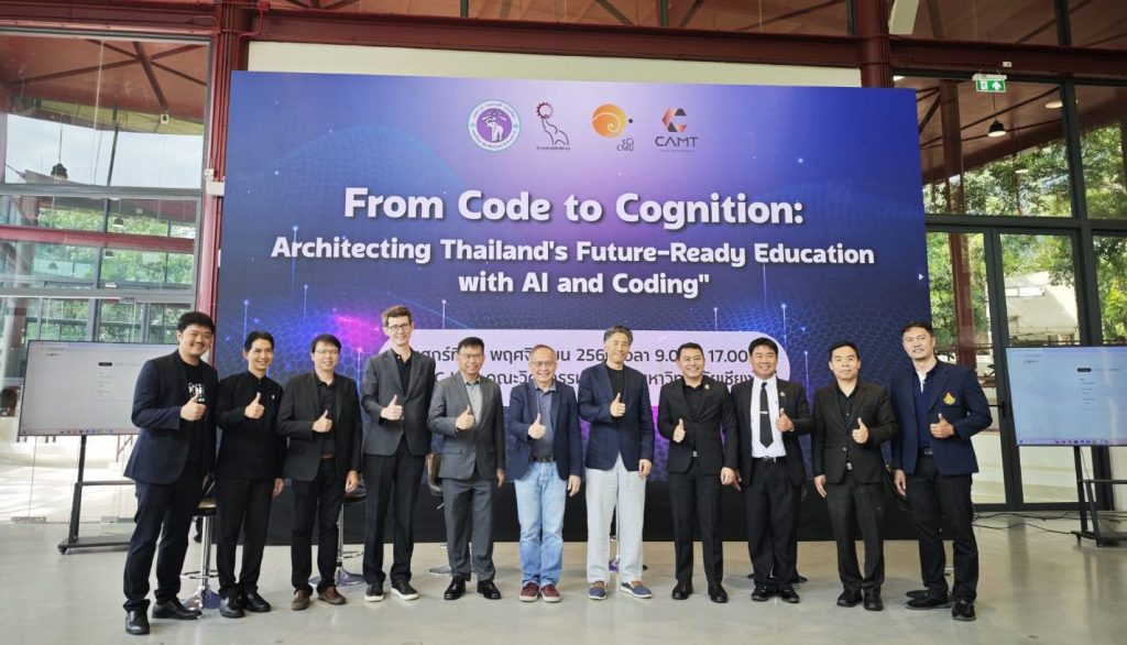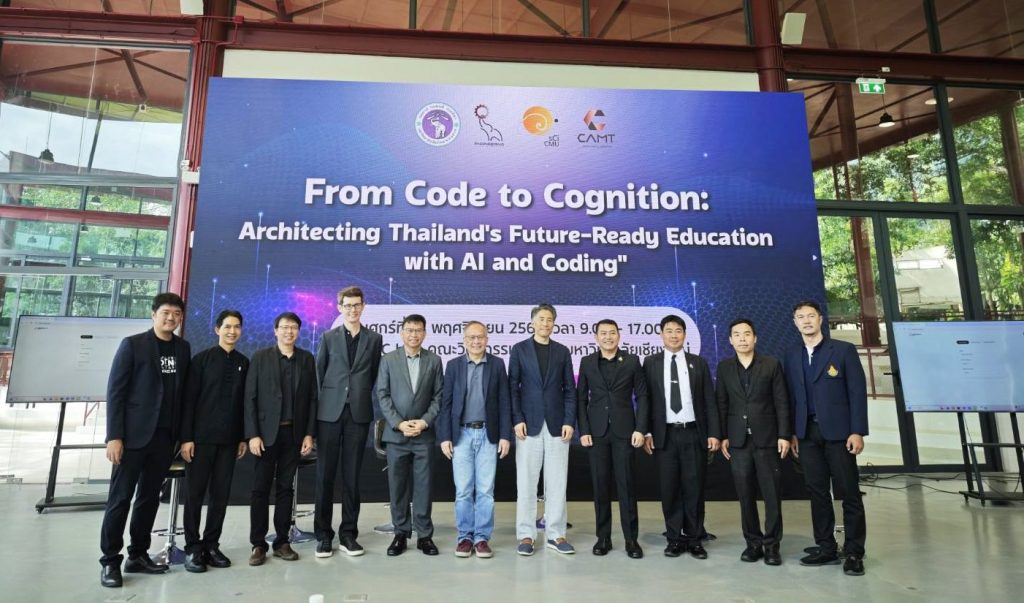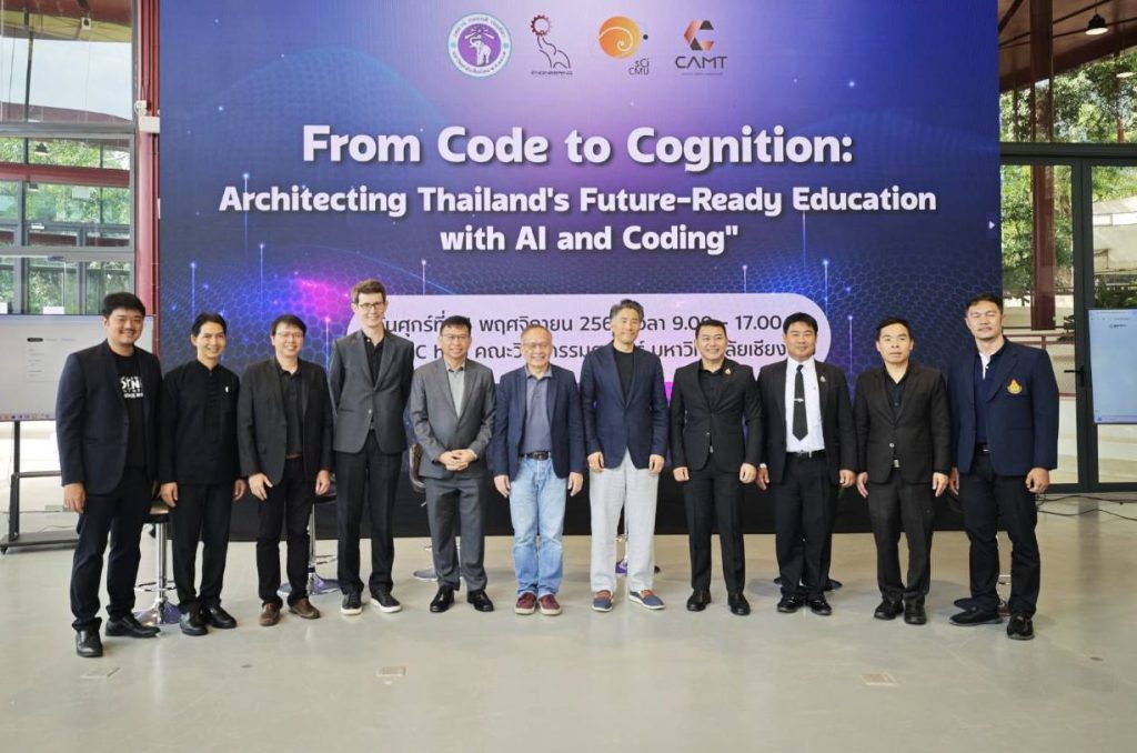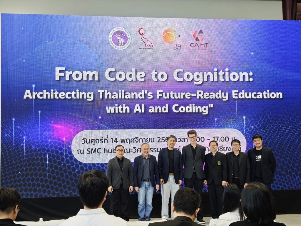 วิทยาลัยศิลปะ สื่อ และเทคโนโลยี มหาวิทยาลัยเชียงใหม่ ร่วมกับคณะวิศวกรรมศาสตร์ และคณะวิทยาศาสตร์ มหาวิทยาลัยเชียงใหม่ ร่วมจัดงาน “From Code to Cognition: Architecting Thailand’s Future-Ready Education with Al and Coding” โดยมีวัตถุประสงค์เพื่อสร้างวิสัยทัศน์ร่วมกันของผู้นำทางการศึกษาในจังหวัดเชียงใหม่ ในการขับเคลื่อนการปฏิรูปการศึกษาด้วยปัญญาประดิษฐ์ให้สอดรับการเปลี่ยนแปลงในศตวรรษที่ 21 ควบคู่กับการถ่ายทอดองค์ความรู้และกำหนดยุทธศาสตร์จากผู้นำการศึกษาระดับโลกให้สออดคล้องกับบริบทสังคมไทยและอาเซียนนำไปสู่แนวปฏิบัติที่ดี (Best Practices) ของจังหวัด พร้อมทั้งสร้างพันธมิตรเชิงยุทธศาสตร์ผ่านเครือข่ายระหว่างสถาบันการศึกษา ภาครัฐ และภาคเอกชน เพื่อผลักดันนโยบายสู่การปฏิบัติอย่างเป็นรูปธรรม โดยภายในงานได้รับเกียรติจาก Mr. Pat Yongpradit Chief Academic Officer, Code.org Lead, TeachAl.org และ ดร.ศักดิ์ เสกขุนทด ที่ปรึกษาวุโส สำนักงานพัฒนาธุรกรรมทางอิเล็กทรอนิกส์ (ETDA) ร่วมปาฐกถาพิเศษใน หัวข้อ “Lessons from a Decade of CS Education and the Dawn of Al in Every Classroom” ในวันศุกร์ที่ 14 พฤศจิกายน 2568 ณ SMC hub คณะวิศวกรรมศาสตร์ มหาวิทยาลัยเชียงใหม่
