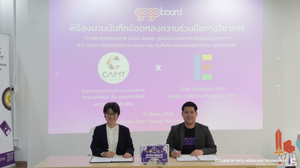 ซึ่งการลงนามในครั้งนี้ได้รับเกียรติจากคุณอัฐพันธุ์ จันทร์อินทร์ กรรมการผู้จัดการบริษัท ลอจิกซ์เอด จำกัด เป็นผู้แทนลงนามจากบริษัท ลอจิกซ์เอด จำกัด ส่วนทางด้านศูนย์นวัตกรรมและการจัดการเทคโนโลยีดิจิทัล ได้รับเกียรติจากผู้ช่วยศาสตราจารย์ ดร.นภาพร รีวีระกุล ผู้อำนวยการศูนย์นวัตกรรมและการจัดการเทคโนโลยีดิจิทัล เป็นผู้แทนร่วมลงนามในพิธีดังกล่าว โดยมีอาจารย์ ดร.วรัญญา มหานันท์ รองผู้อำนวยการศูนย์นวัตกรรมและการจัดการเทคโนโลยีดิจิทัล และผู้ช่วยศาสตราจารย์ ดร.ภคินี อริยะ ผู้ร่วมดำเนินโครงการ “การขยายผลโครงการ GoGo Board: หุ่นยนต์ส่งเสริมการเรียนรู้แบบบูรณาการด้าน STEM EDUCATION สำหรับเยาวชน ในพื้นที่ระเบียงเศรษฐกิจพิเศษ ภูมิภาคเหนือ” พร้อมด้วยคณะผู้บริหาร คณาจารย์ หน่วยงาน และสถาบันการศึกษา กว่า 13 ส่วนงาน ร่วมเป็นสักขีพยาน ในวันศุกร์ที่ 13 มีนาคม 2569 ณ Builds CMU,อาคารศูนย์สุขภาพ มหาวิทยาลัยเชียงใหม่
