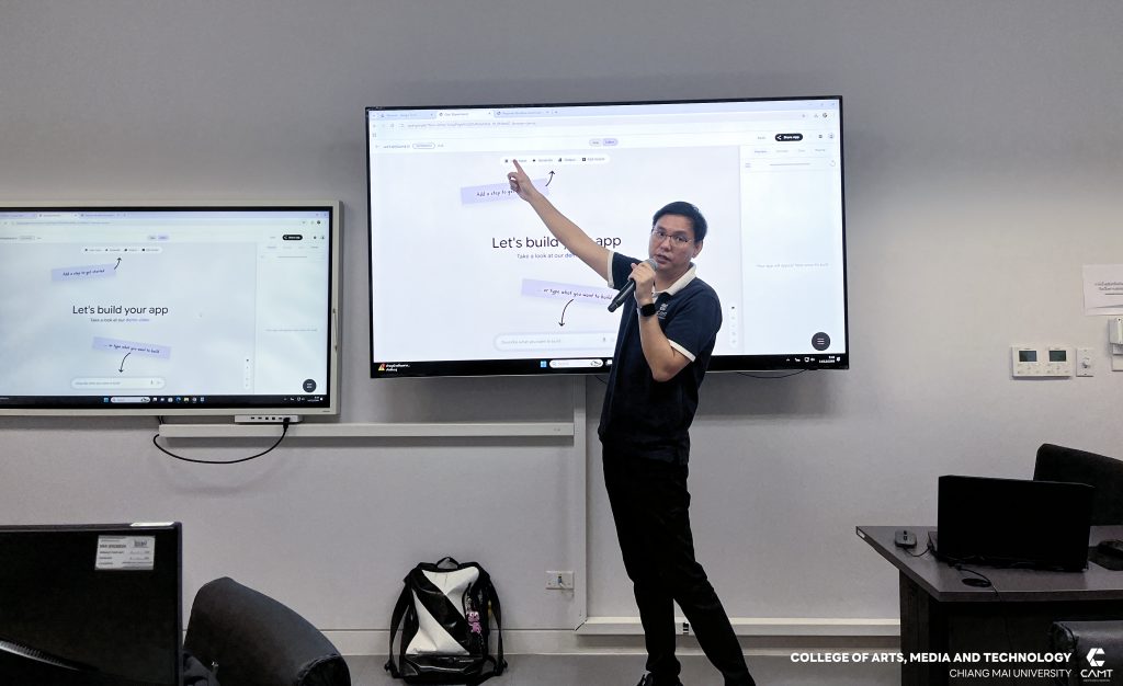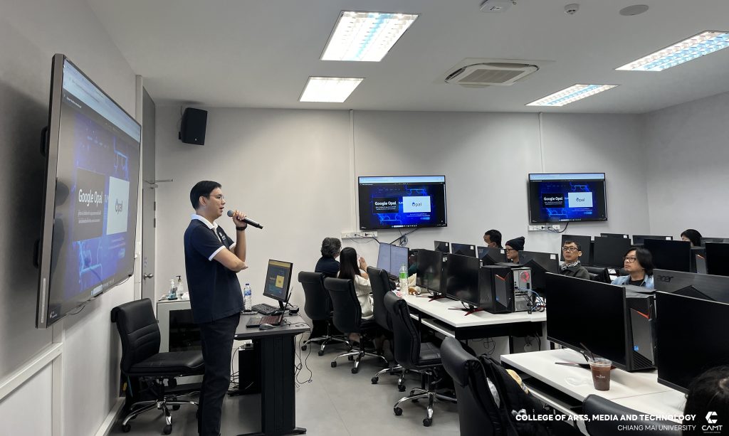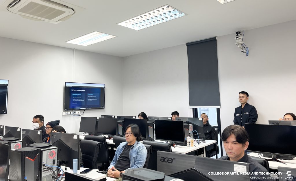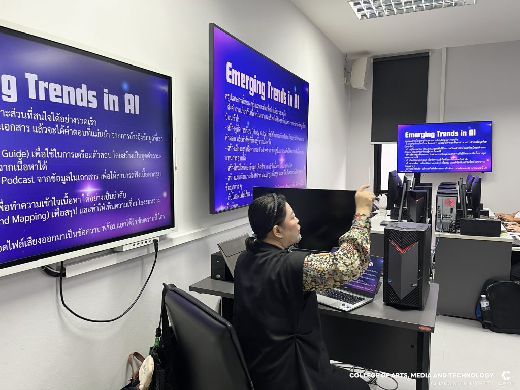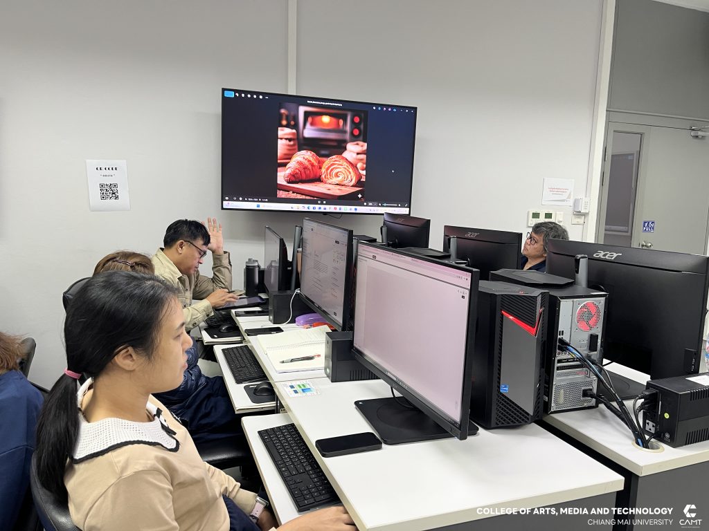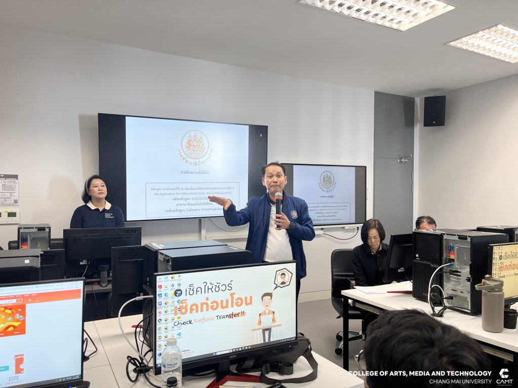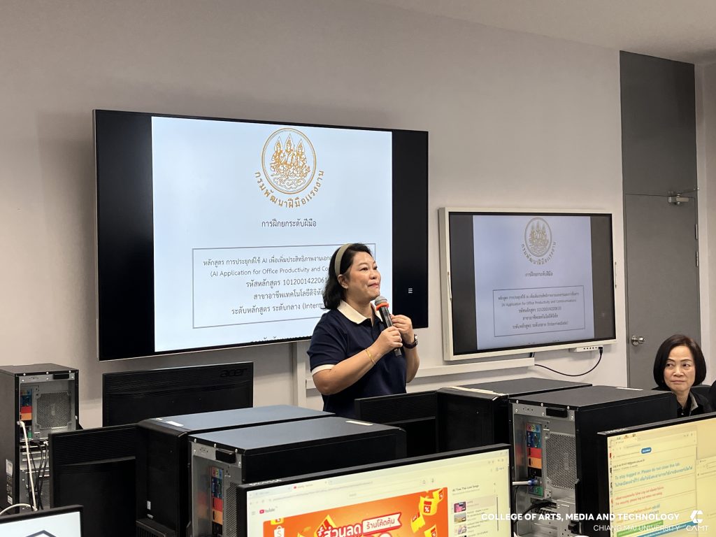 ศูนย์นวัตกรรมและการจัดการเทคโนโลยีดิจิทัล (DITC) วิทยาลัยศิลปะ สื่อ และเทคโนโลยี มหาวิทยาลัยเชียงใหม่ ร่วมกับ สถาบันพัฒนาฝีมือแรงงาน 19 เชียงใหม่ โดยมีผู้ช่วยศาสตราจารย์ ดร.สมเกียรติ น่วมนา ผู้ช่วยคณบดีวิทยาลัยศิลปะ สื่อ และเทคโนโลยี พร้อมด้วยผู้ช่วยศาสตราจารย์ ดร.รัศมิ์ลภัส สุตีคา หัวหน้าสำนักวิชาวิทยาลัยศิลปะ สื่อ และเทคโนโลยี ดำเนินการจัดอบรมหลักสูตร “การประยุกต์ใช้ AI เพื่อเพิ่มประสิทธิภาพงานเอกสารและการสื่อสาร (AI Application for Office Productivity and Communication)” ให้แก่ผู้ประกอบการทางด้านเทคโนโลยีดิจิทัล โดยมีวัตถุประสงค์หลักเพื่อให้ผู้เรียนมีความรู้ และทักษะ ตลอดจนมีทัศนคติที่ดีในการประยุกต์ใช้ AI เพื่อเพิ่มประสิทธิภาพงานเอกสารและการสื่อสาร โดยสามารถ อธิบายเกี่ยวกับจริยธรรมและความปลอดภัยในการใช้ AIเลือกใช้เครื่องมือ AI ในองค์กรได้ การใช้ AI จัดการงานเอกสารสื่อสารและการนำเสนอในองค์กรได้ รวมถึงออกแบบ Workflow ร่วมกับ AI ได้อย่างมีประสิทธิภาพ ระหว่างวันที่ 12 – 14 ธันวาคม 2568 ณ ห้องเรียน C304 และ C305 อาคารศูนย์นวัตกรรมการเรียนรู้ มหาวิทยาลัยเชียงใหม่
